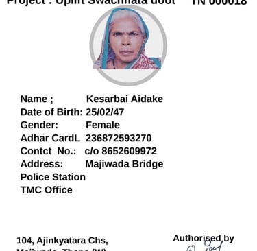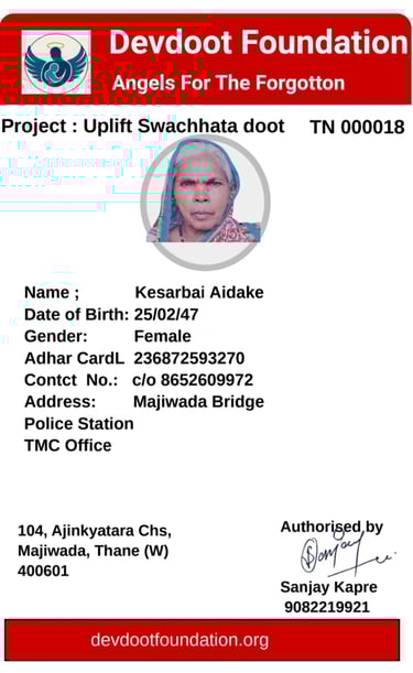 “I don’t have anyone... so I pick plastic to survive.” Kesarbai Aidake, born on 25 February 1947, lives in the slums of Kalwa, Thane. At 78, instead of enjoying rest and care, she walks the narrow alleys daily — dragging a sack almost her size, picking plastic bottles, paper, or metal scraps. She doesn’t complain. She doesn’t beg. She survives — quietly. 💔 The Unseen Life Kesarbai’s days are shaped by hunger, loneliness, and uncertainty. Despite being a vital part of our waste ecosystem, she is: Unrecognized by the government Unprotected by welfare Unseen by society She earns just ₹20–₹30 a day. Enough for a meal, but not enough for medicine, clean clothes, or a roof that doesn’t leak. 🌟 When Devdoot Foundation Found Her During a ground visit to Kalwa slums, our volunteers met Kesarbai. Her story reflects the struggle of thousands of elderly ragpickers who work silently, unseen and unsupported. Moved by her strength and pain, we enrolled her under our Uplift Swachhata Doot initiative. ✅ Devdoot Foundation Has Provided: Monthly ration and nutrition kits Clean clothing and basic footwear Medical check-ups and medicine Emotional support and community connection Help to register for senior citizen government schemes Most importantly — ✅ A personalized Devdoot Foundation ID card 📸 Photo 2: (Insert here) Kesarbai proudly holding her Devdoot Foundation ID card — her first ever identity proof after decades. 🕊️ Giving Her Dignity — Not Just Donations For someone like Kesarbai, having an ID card means more than paperwork — it means belonging. It opens doors to ration, healthcare, and possible pension. Most of all, it says: “You are seen.” 👐 Be a Devdoot – An Angel for the Forgotten “She’s cleaned our streets for decades. Can we now help clean her life?” Here’s how you can support: 💰 Amount ❤️ Impact ₹100 1 warm, nutritious meal ₹500 1 month’s food and basic needs ₹1000 Clothing + medicine + transport 📲 Donate Now → (Insert UPI link or payment gateway) 📞 Volunteer / Visit → WhatsApp: 9082219921 🌐 Website: www.DevdootFoundation.org 📣 Help Us Share Her Story Every Kesarbai matters. Every ragpicker has a name, a birthday, a story. They deserve more than our silence. 📢 Share this blog 🤝 Tag a donor or volunteer 📍 Visit us or invite us to your community Devdoot Foundation – Angels for the Forgotten 🌿 Because no one deserves to die unknown.